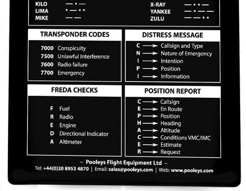 Slim fit board ideal for small cockpits. Fitted with a single pen clip and spring clip. Elasticated velcro fastening thigh strap and moulded, cushioned back for comfort. Printed white lettering detailing quadrantal and semi-circular rules, phonetic alphabet, morse code, selected transponder codes and mnemonic position report.